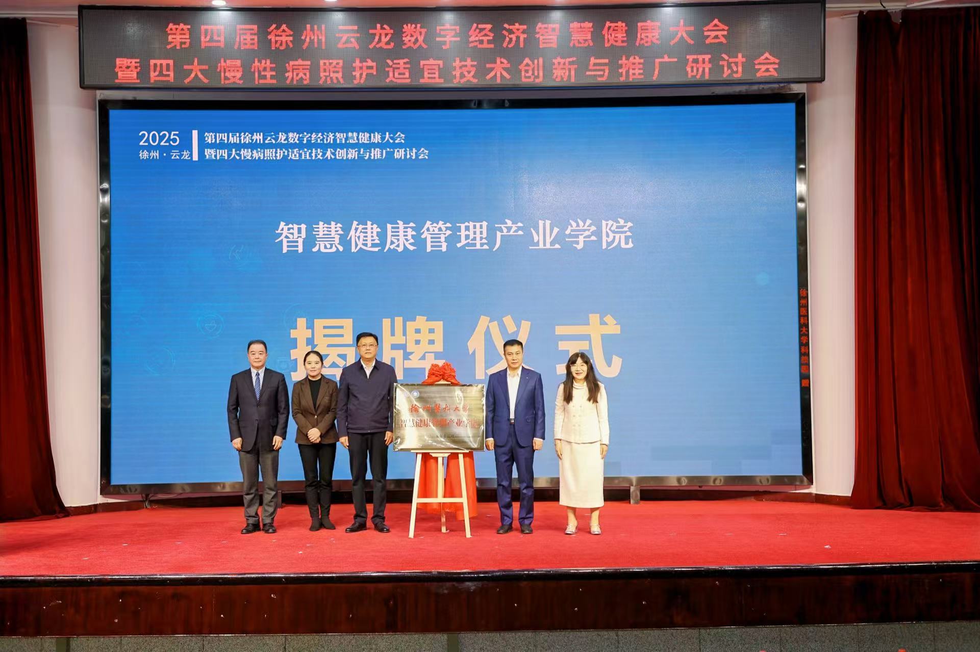 随后举行的智慧健康管理产业学院揭牌仪式将开幕式推向高潮。徐州市委员会常委吴卫东秘书长、徐州医科大学副校长刘慎军教授、教育部护理学类专业教学指导委员会秘书长孙宏玉教授、云龙区委员会陈婕书记、原天津中医药大学党委常委、副校长王耀刚教授共同为学院揭牌。该学院的成立是深化产教融合的重要举措,将整合政府、高校、企业优质资源,构建“政产学研用”一体化平台,为健康产业发展提供新动能。