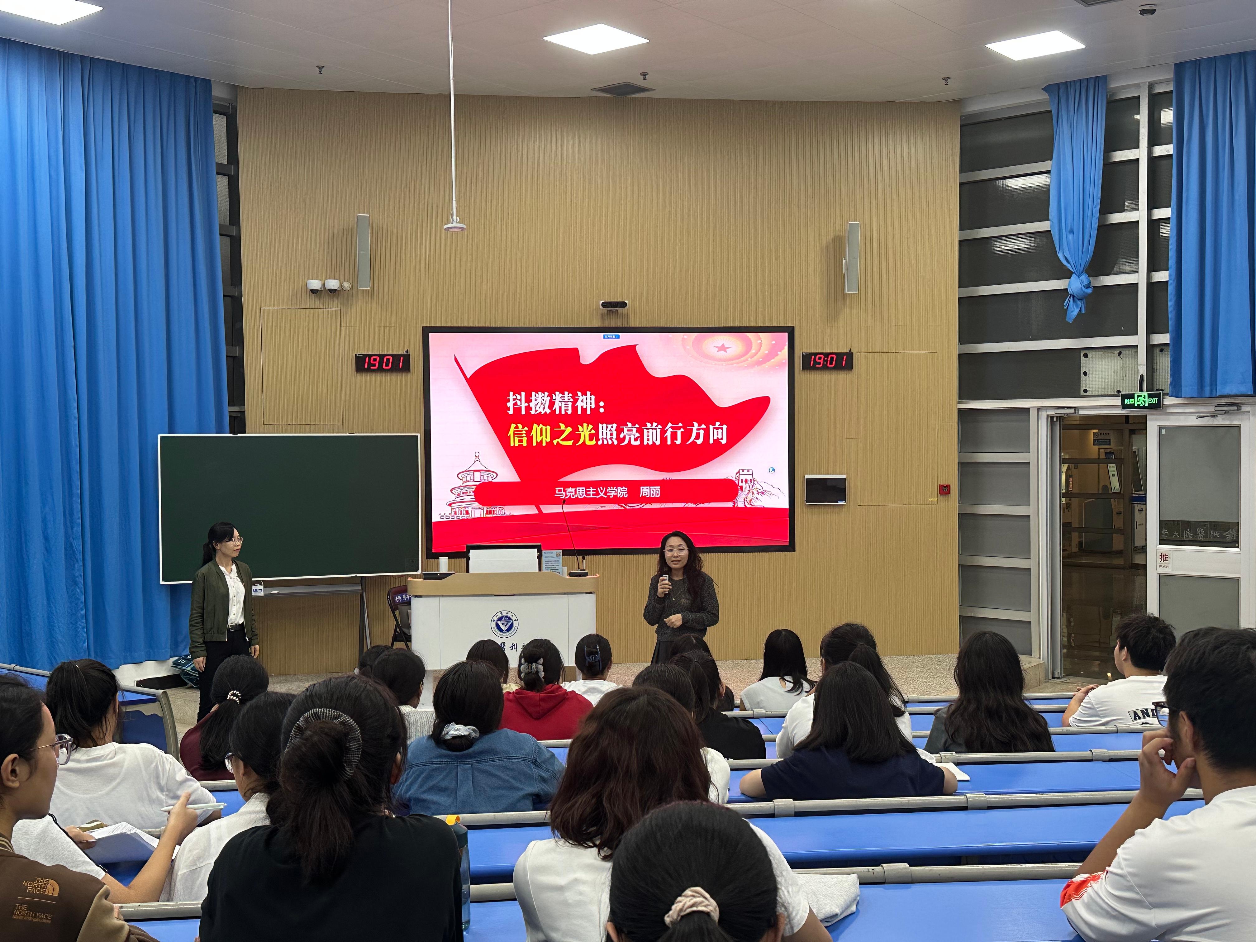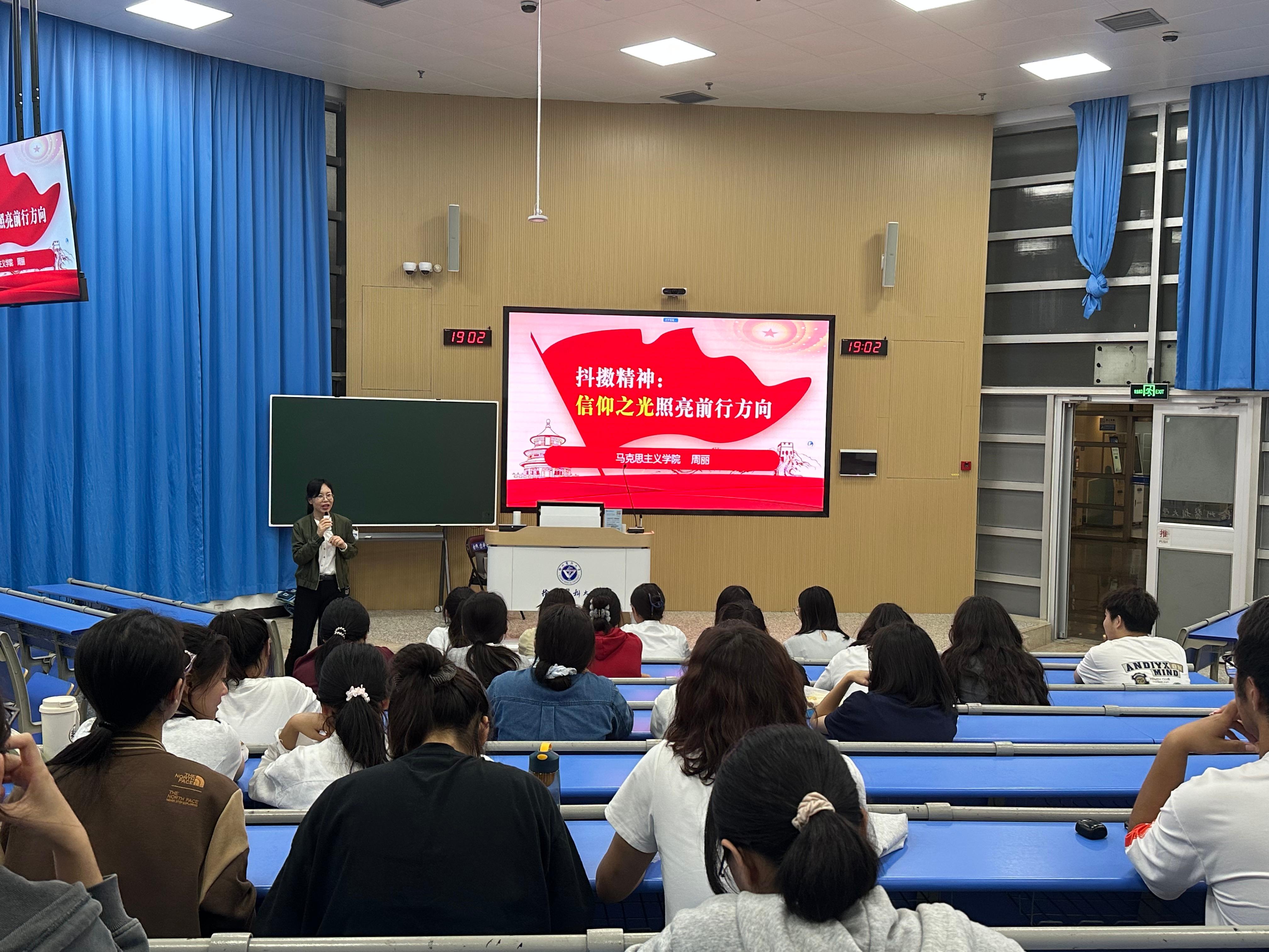 周丽老师以“何为信仰”为切入点,结合中国共产党百年奋斗的光辉历程与伟大成就,深刻阐释了马克思主义信仰的科学性与真理性。她通过一系列生动感人的革命先辈事迹与时代楷模案例,层层递进,向同学们展现了信仰如何凝聚力量、指引方向、铸就辉煌。整场讲座引经据典、深入浅出,既有理论高度,又贴近学生实际,引发了同学们的深入思考与强烈共鸣。