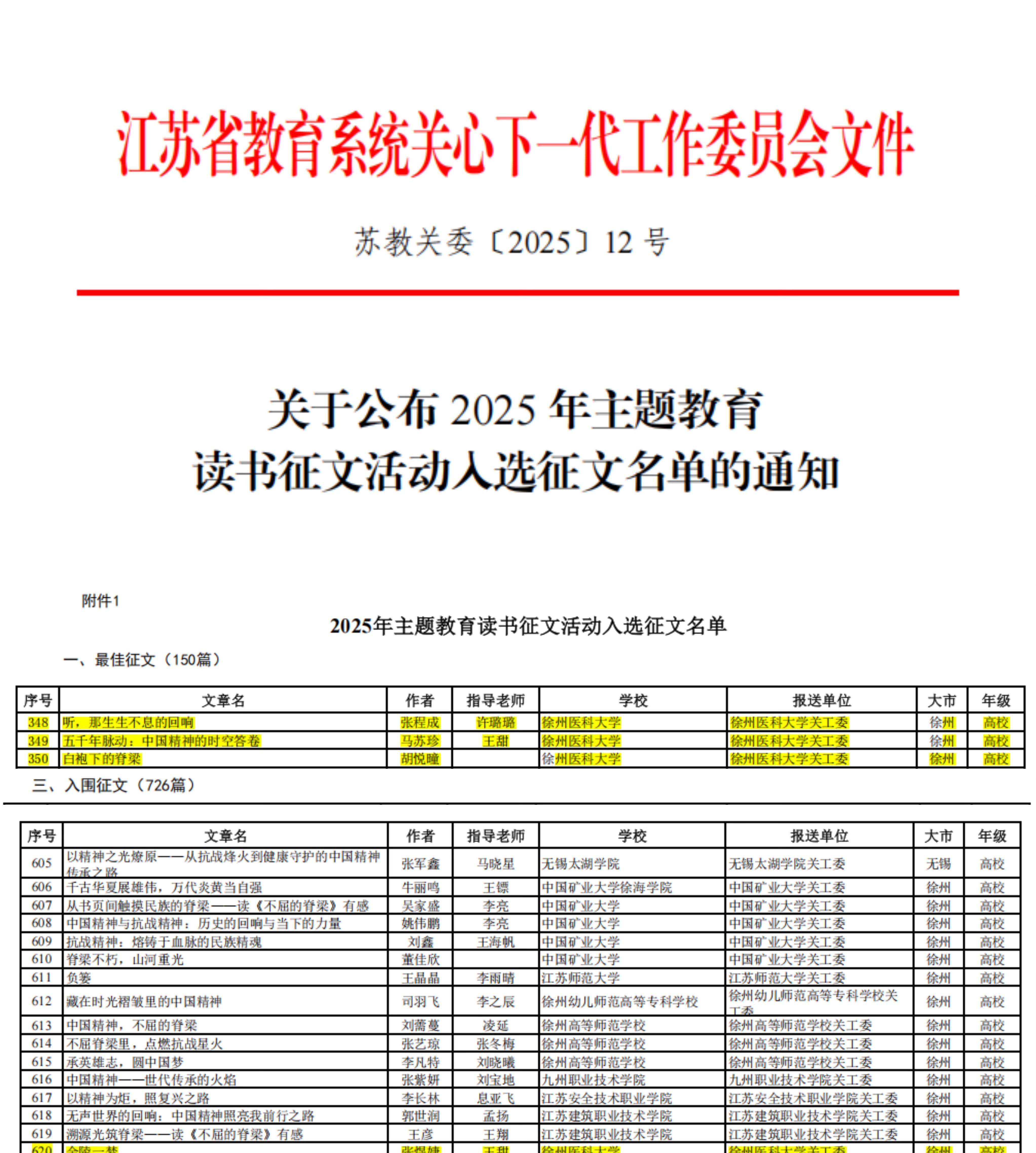 近日,江苏省教育系统关工委发布《关于公布2025年主题教育读书征文活动入选征文名单的通知》(苏教关委〔2025〕12号),我院共有2篇佳作(全校共5篇)脱颖而出,成功入选。