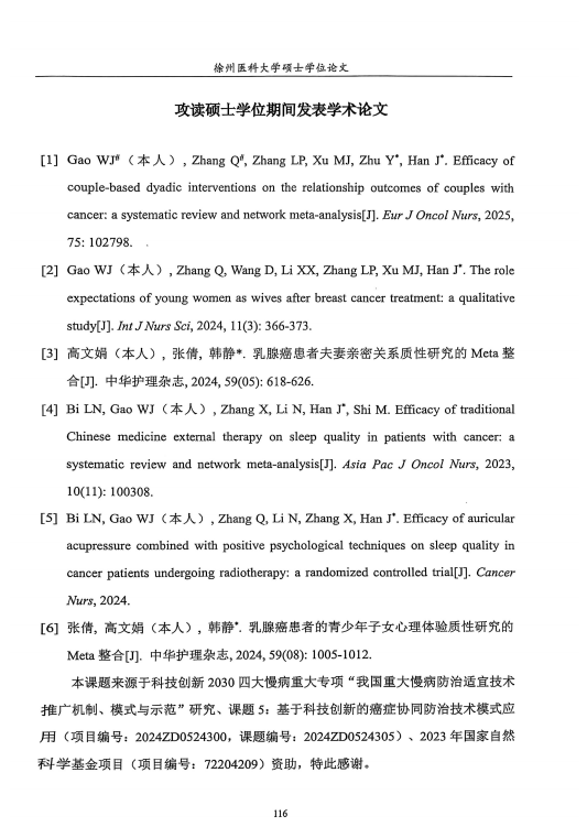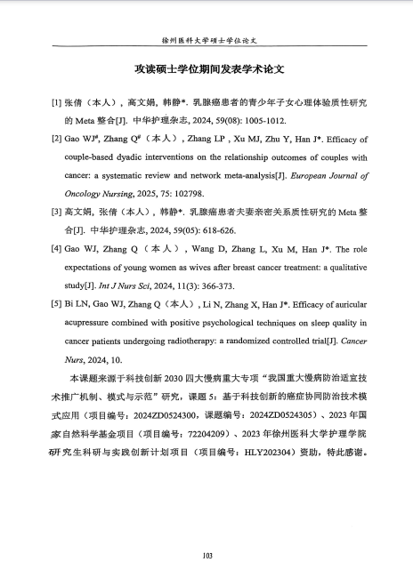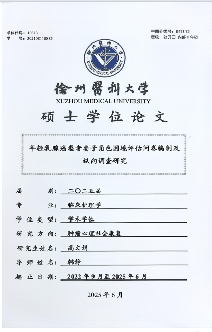 1.高文娟(硕士):年轻乳腺癌患者妻子角色困境评估问卷编制及纵向调查研究